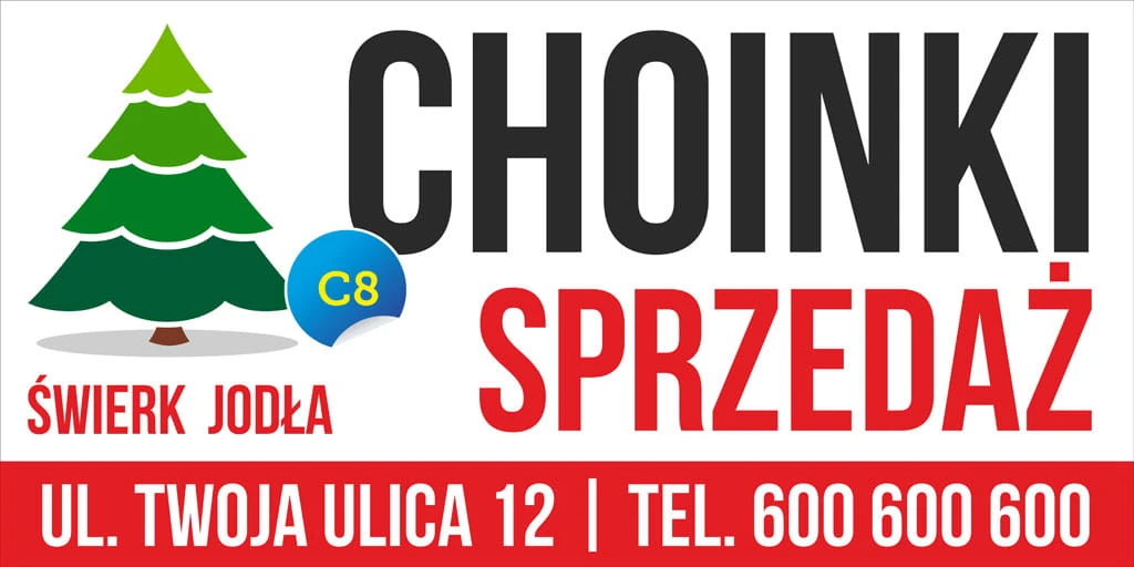 Zainwestuj w baner reklamowy Sprzedaż choinek i wyróżnij swoją ofertę świąteczną – skuteczny, trwały, efektowny i gotowy do montażu. Dzięki naszym banerom świątecznym Twoja promocja choinek będzie widoczna, przyciągająca uwagę i skutecznie zwiększy sprzedaż w tym sezonie.