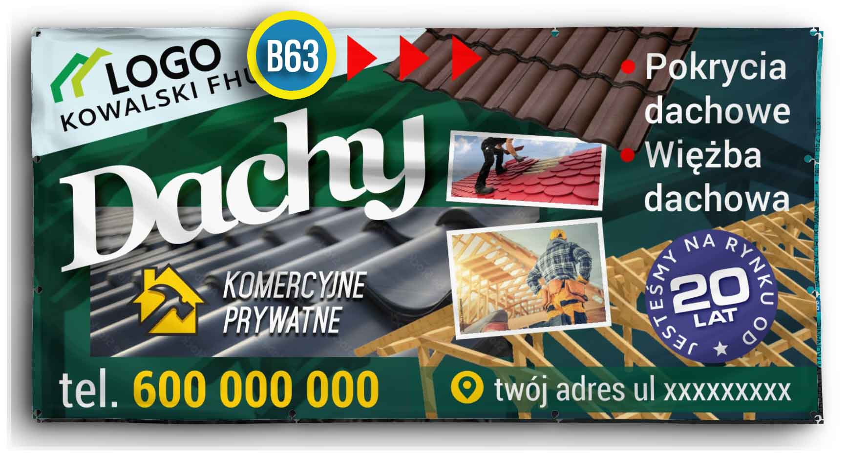 Baner dachy i pokrycia dachowe to skuteczna forma reklamy firm dekarskich, składów budowlanych oraz sprzedaży materiałów dachowych. Baner reklamowy informuje o ofercie pokryć dachowych, takich jak blachodachówka, dachówka ceramiczna i betonowa, blacha trapezowa, papa dachowa oraz akcesoria dachowe. Czytelny baner dachy przyciąga uwagę klientów poszukujących materiałów na budowę lub remont dachu i zwiększa widoczność firmy w terenie.