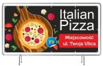 Baner reklamowy ‘Pizza’ to skuteczny nośnik reklamy stworzony do promocji pizzerii, pizzy na wynos, dowozu pizzy, restauracji włoskich, pizzy z pieca kamiennego, pizzy neapolitańskiej oraz dań typu fast food. Wysokiej jakości baner pizza wykonany z trwałego materiału i z intensywnym, odpornym na warunki atmosferyczne nadrukiem doskonale sprawdza się na elewacjach lokali, przy food truckach i punktach gastronomicznych, zwiększając widoczność lokalu oraz przyciągając klientów szukających świeżej, gorącej pizzy w okolicy.