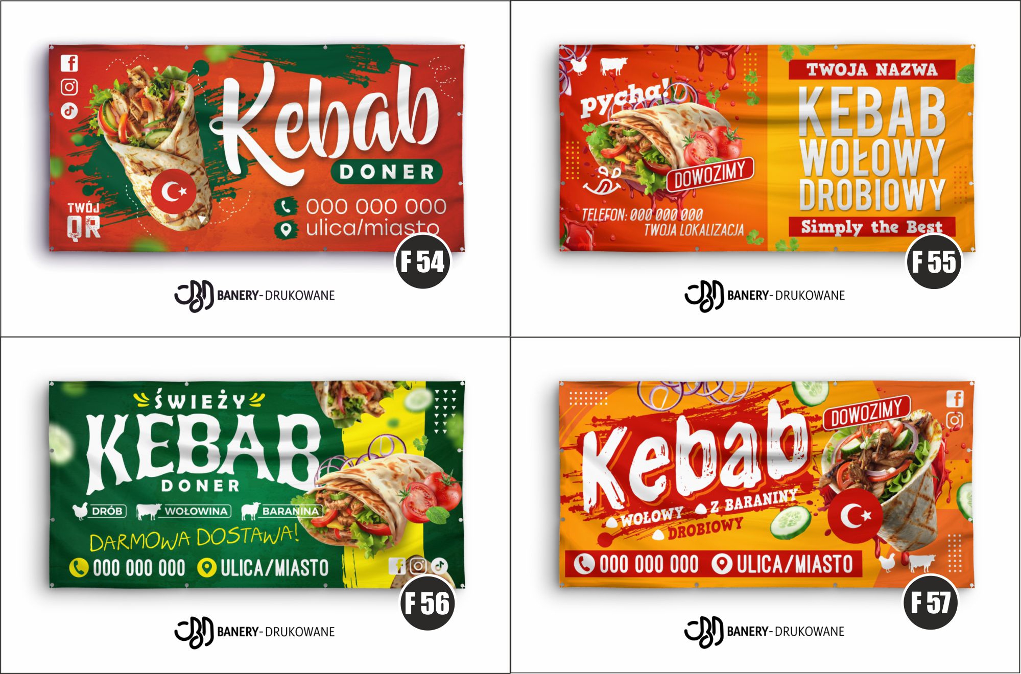 Baner ‘Kebab’ pozwala w prosty sposób oznaczyć lokal i promować kebab w bułce, kebab w tortilli, kebab na talerzu, kebab box, dania na wynos, dowóz jedzenia oraz ofertę lunchową. To idealne rozwiązanie marketingowe dla barów kebab, restauracji typu street food i punktów gastronomicznych, które chcą zwiększyć ruch klientów i rozpoznawalność marki.