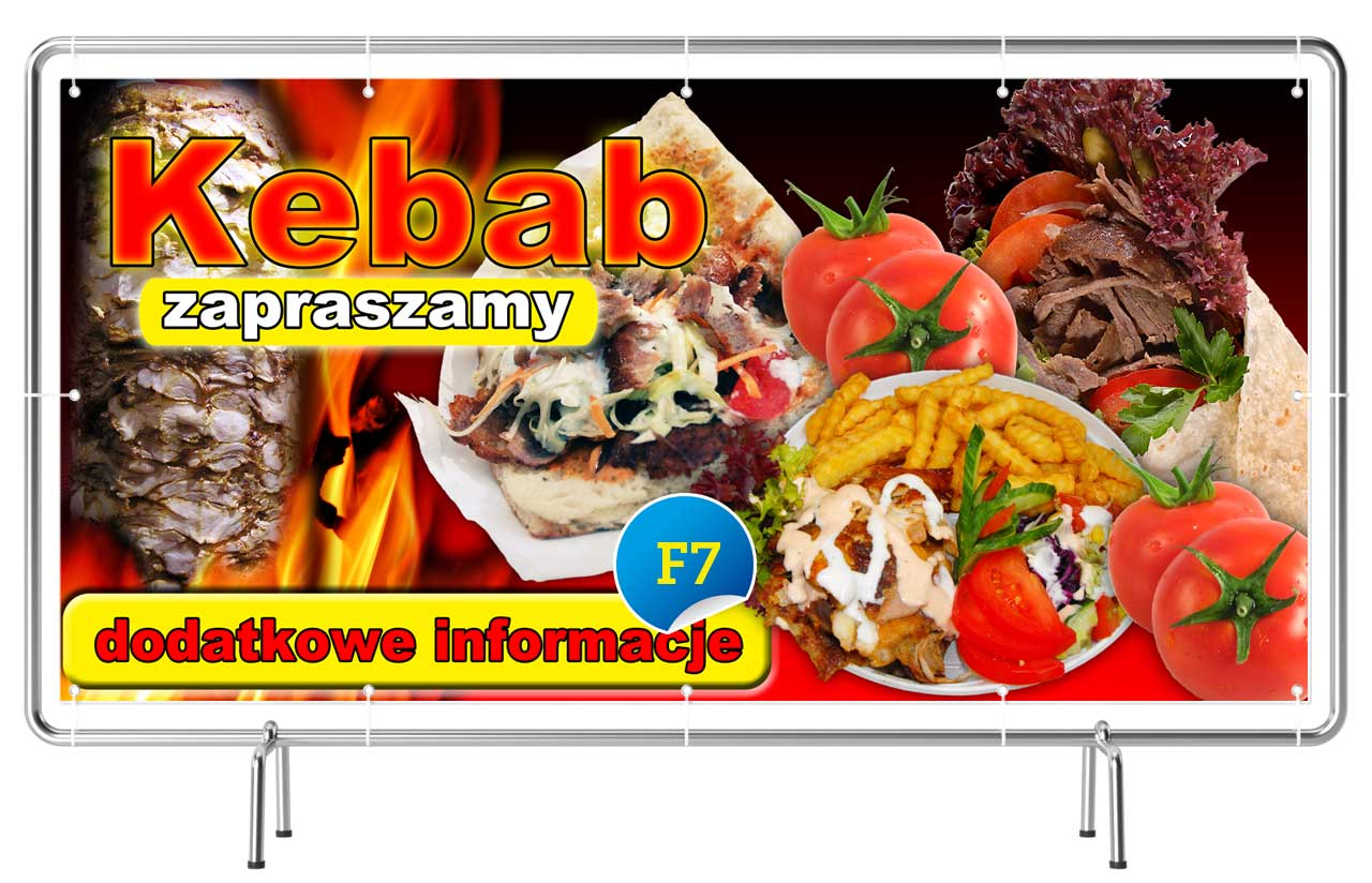 Baner reklamowy ‘Kebab’ to skuteczny nośnik reklamy stworzony do promocji punktów gastronomicznych, kebabów na wynos, restauracji fast food, barów z kebabem, dań z kurczaka i wołowiny oraz kuchni orientalnej. Wysokiej jakości baner kebab wykonany z trwałego materiału i z intensywnym, odpornym na warunki atmosferyczne nadrukiem doskonale sprawdza się na zewnątrz lokalu, przy food truckach oraz w strefach gastronomicznych, zwiększając widoczność punktu sprzedaży i przyciągając klientów szukających szybkiego i smacznego jedzenia.
