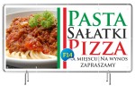 Baner reklamowy ‘Pizza’ to skuteczny nośnik reklamy stworzony do promocji pizzerii, pizzy na wynos, dowozu pizzy, restauracji włoskich, pizzy z pieca kamiennego, pizzy neapolitańskiej oraz dań typu fast food. Wysokiej jakości baner pizza wykonany z trwałego materiału i z intensywnym, odpornym na warunki atmosferyczne nadrukiem doskonale sprawdza się na elewacjach lokali, przy food truckach i punktach gastronomicznych, zwiększając widoczność lokalu oraz przyciągając klientów szukających świeżej, gorącej pizzy w okolicy.