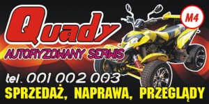 Baner reklamowy ‘Quady i Skutery – Wypożyczalnia i Sprzedaż’ to profesjonalny nośnik reklamy stworzony z myślą o skutecznej promocji wypożyczalni quadów i skuterów, sprzedaży nowych i używanych pojazdów, serwisu, akcesoriów oraz części zamiennych. Wysokiej jakości baner quady i skutery wykonany z trwałego materiału i z wyraźnym, odpornym na warunki atmosferyczne nadrukiem doskonale sprawdza się przy salonach sprzedaży, punktach wypożyczalni, eventach motoryzacyjnych oraz placach testowych, zwiększając widoczność firmy i przyciągając klientów szukających pojazdów do rekreacji, sportu i transportu.