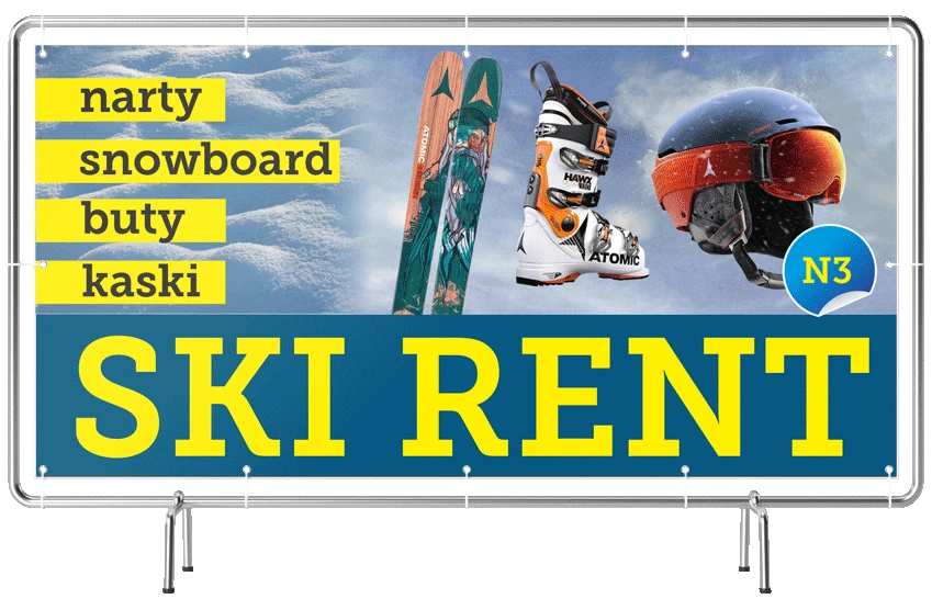 Baner szkoła narciarska i wypożyczalnia sprzętu jest trwały, odporny na warunki zimowe i doskonale sprawdza się w sezonie narciarskim. Wybierając taki baner, inwestujesz w skuteczną promocję usług zimowych, zwiększając widoczność i sprzedaż.