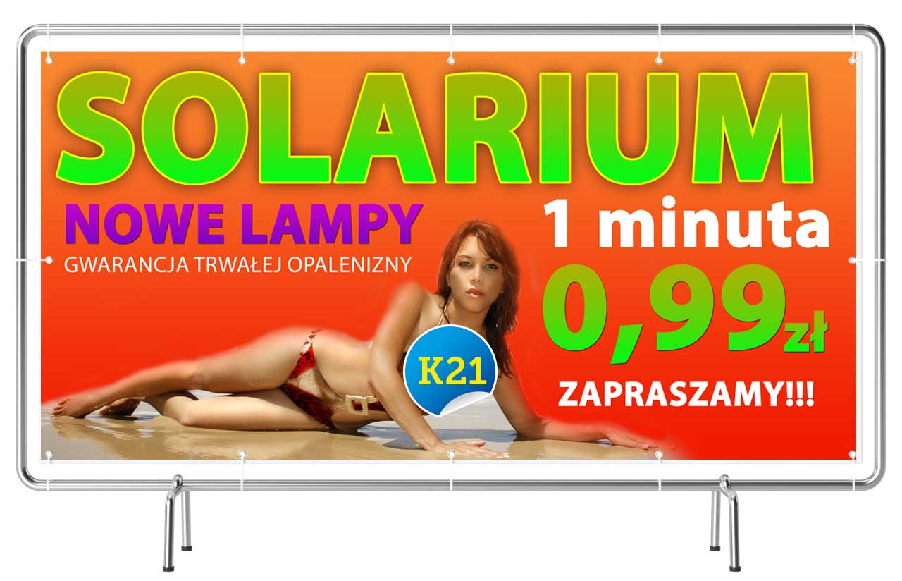 Baner ‘Solarium’ pozwala w prosty sposób oznaczyć salon i promować opalanie na stojąco i leżąco, szybkie sesje opalania, nowoczesne urządzenia UV, kosmetyki przyspieszające opalanie oraz usługi salonów opalania. To skuteczne narzędzie marketingowe dla studiów solarium, salonów beauty i punktów kosmetycznych, które realnie zwiększa liczbę klientów oraz rozpoznawalność marki.