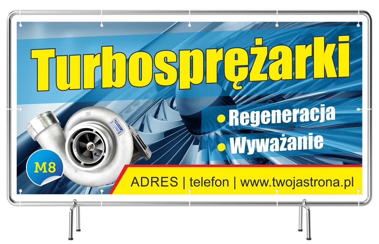Baner reklamowy ‘Turbosprężarki – Naprawa’ to profesjonalny nośnik reklamy usług motoryzacyjnych, stworzony z myślą o skutecznej promocji naprawy turbosprężarek, regeneracji turbin, serwisu turbo oraz diagnostyki układu doładowania w warsztatach samochodowych i specjalistycznych serwisach mechanicznych. Wysokiej jakości baner turbosprężarki wykonany z trwałego materiału i z wyraźnym, odpornym na warunki atmosferyczne nadrukiem doskonale sprawdza się na zewnątrz i wewnątrz budynków, zwiększając widoczność serwisu przy drodze, na parkingu lub w strefach przemysłowych.