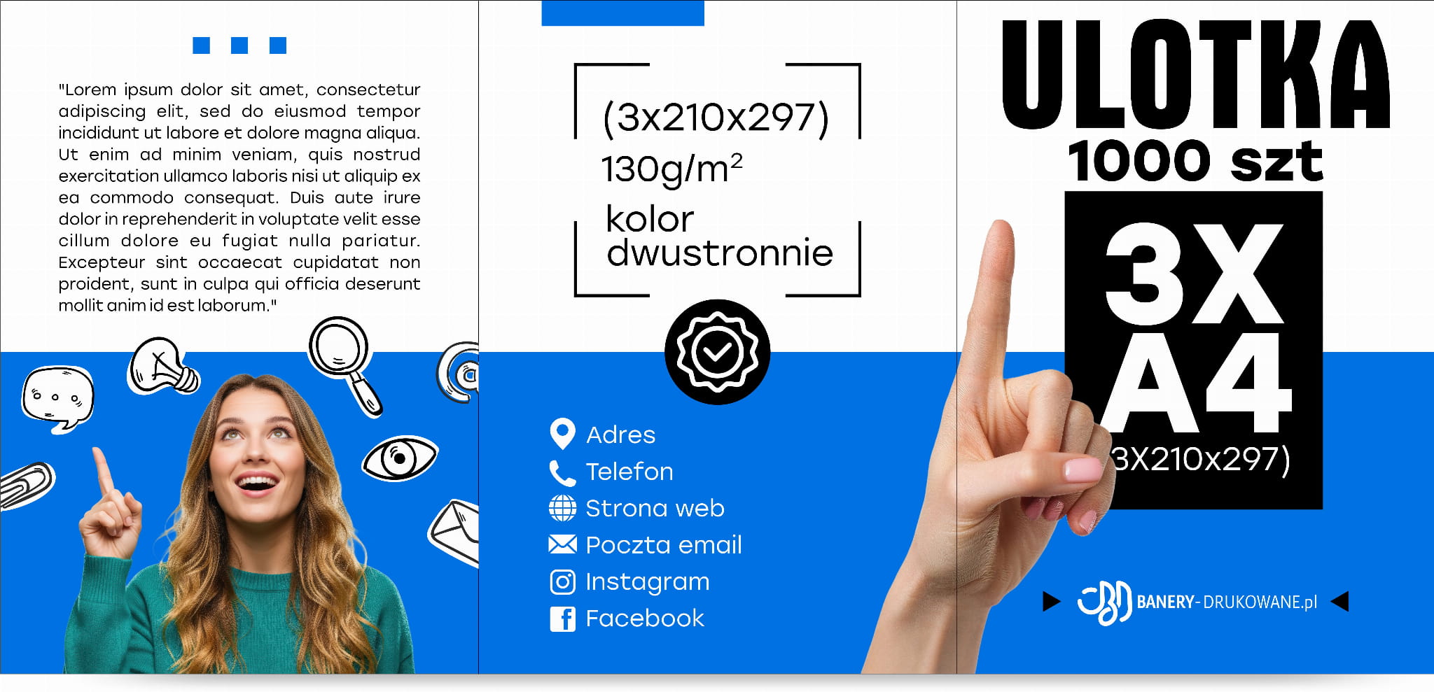 Ulotki składane 3×A4 to duży i profesjonalny format reklamowy, który zapewnia dużo miejsca na treść, grafikę i ofertę firmy. Idealne do katalogów produktów, prezentacji usług, materiałów promocyjnych oraz kampanii marketingowych wymagających czytelnej i estetycznej prezentacji informacji.